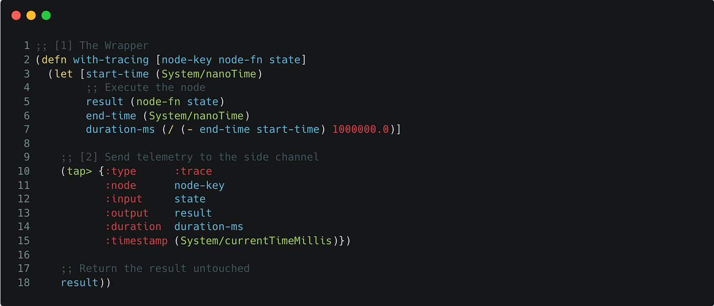 Brilliant breakdown of the core mechanics! The tap> approach for observability is clever tbh, way cleaner than wrestling with logging frameworks. I've run into similar 'class explosion' issues when trying to customize LangChain for edge cases, and seeinghow much can be done with pure fucntions is refreshing.