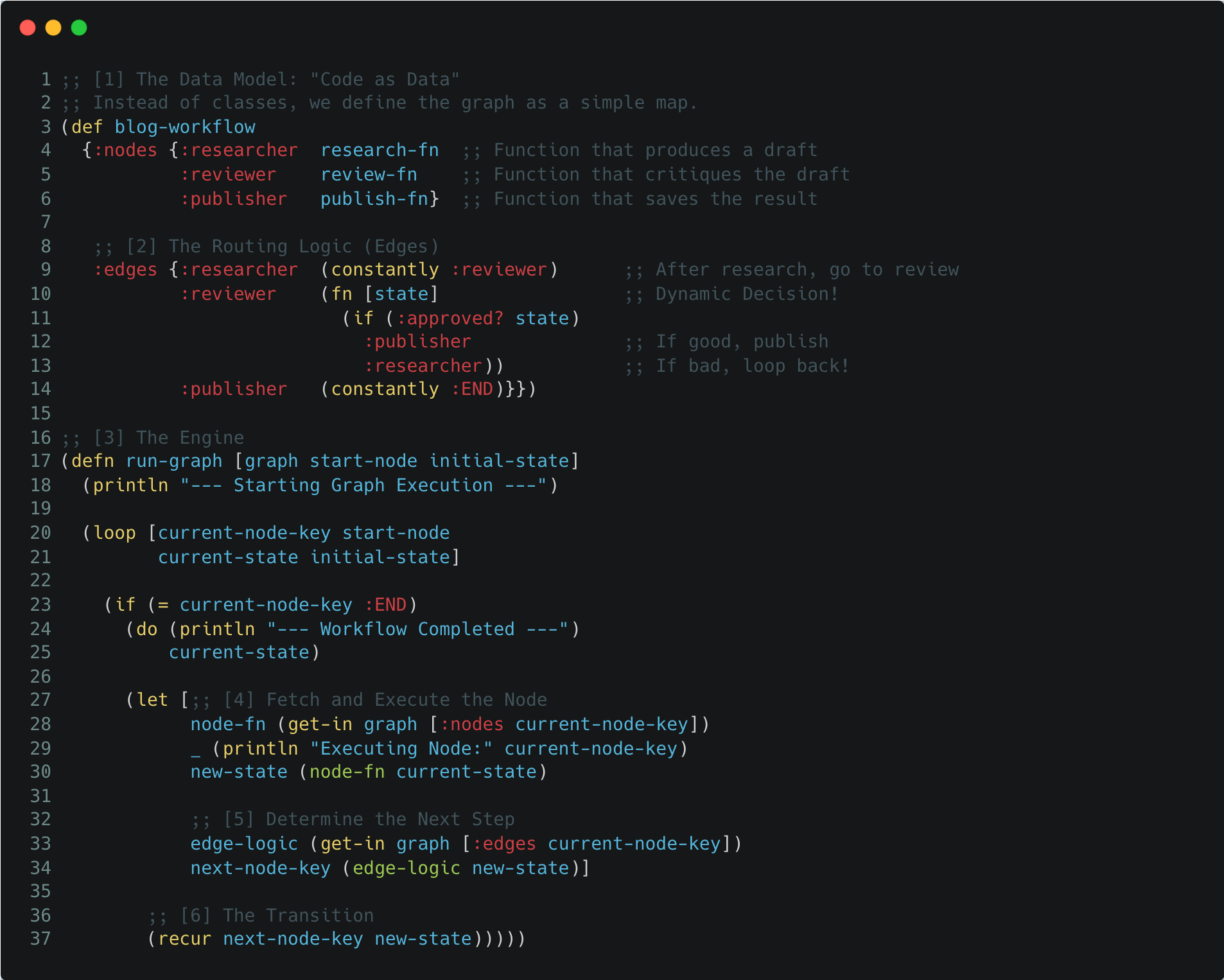 I didn’t want the “magic.” I wanted to see the gears. So, I decided to step back from the heavy frameworks and build a minimal, functional, agentic engine using Clojure. My goal was not to replace LangGraph, but to de-mystify it.