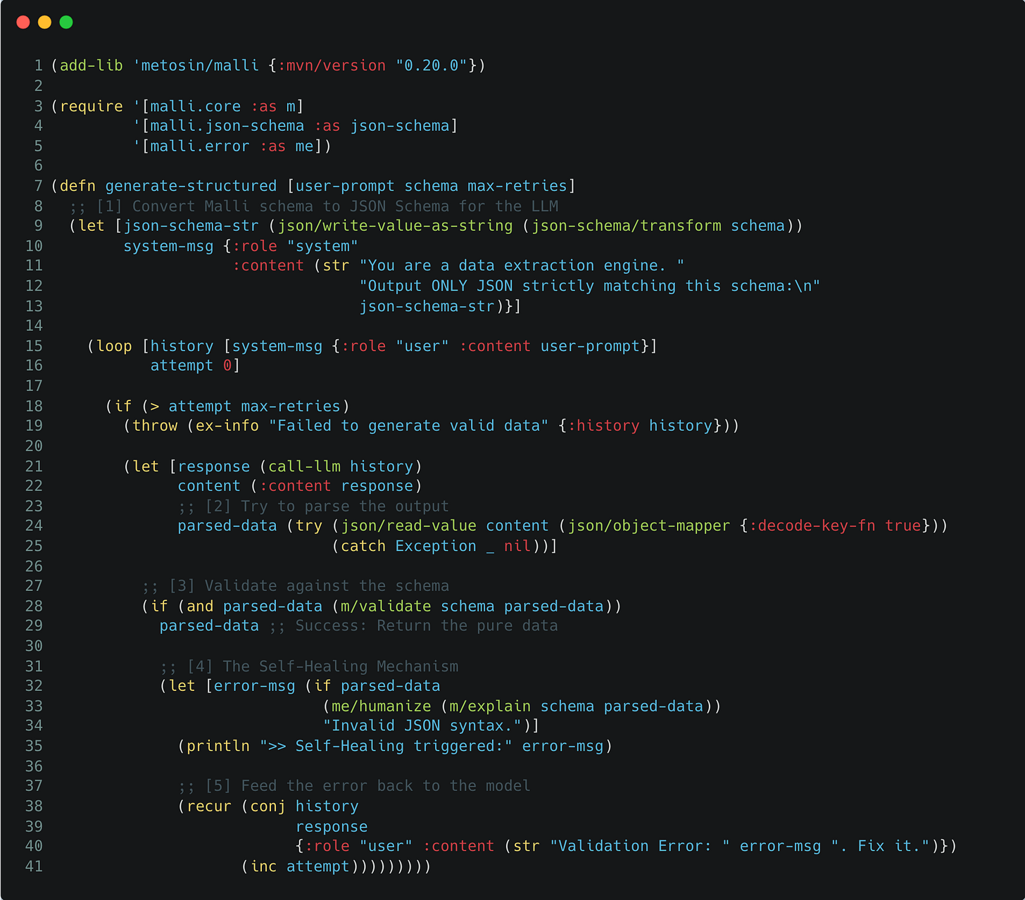We will use metosin/malli to define exactly what we want. But we will go a step further. We won’t just hope the model gets it right; we will build a Self-Healing Loop. If the model’s output doesn’t match our schema, we won’t crash. Instead, we will feed the validation error back to the model and say, “You made a mistake here. Fix it.”
