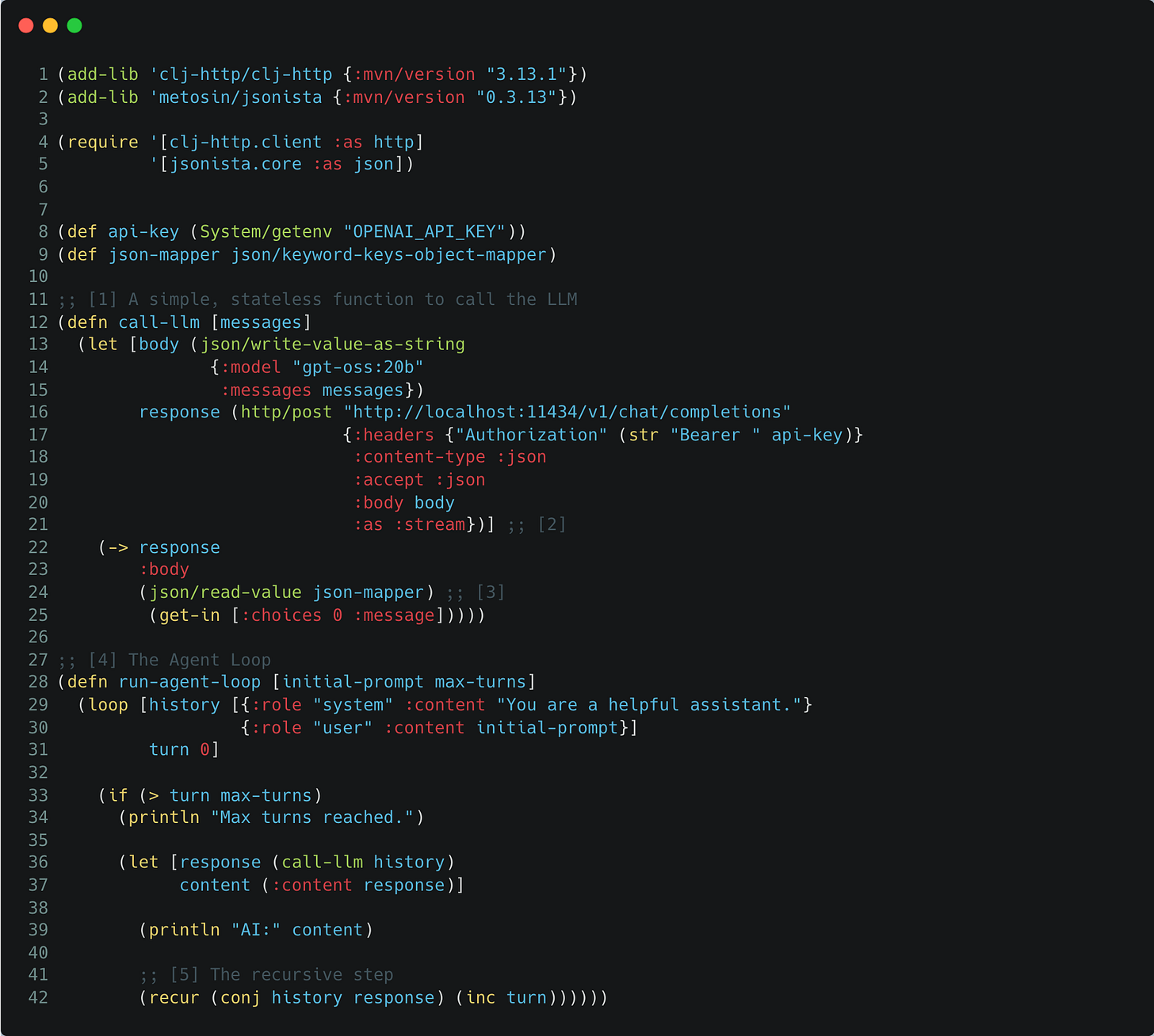 We need two things to start: a way to talk to the LLM and a loop to maintain the conversation state. We will use clj-http for the network and jsonista for high-performance JSON handling.